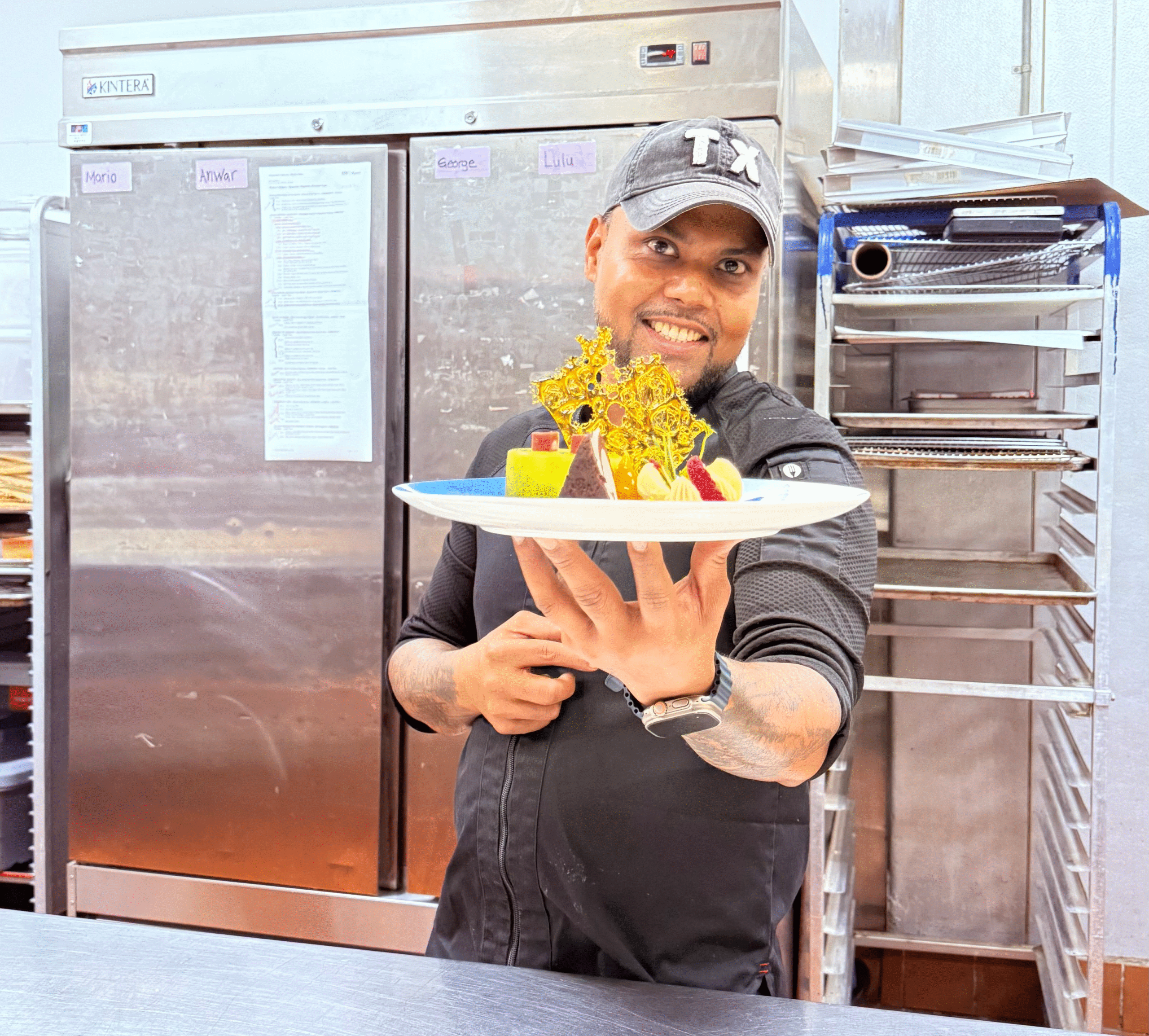 Cranberry Fudge Brownie | Homemade Hazelnut Crunch | Salted Soft Caramel Manjari Chocolate Anglaise | Passionfruit Consommé | Cocoa Nib Tuile Blackberry Caviar